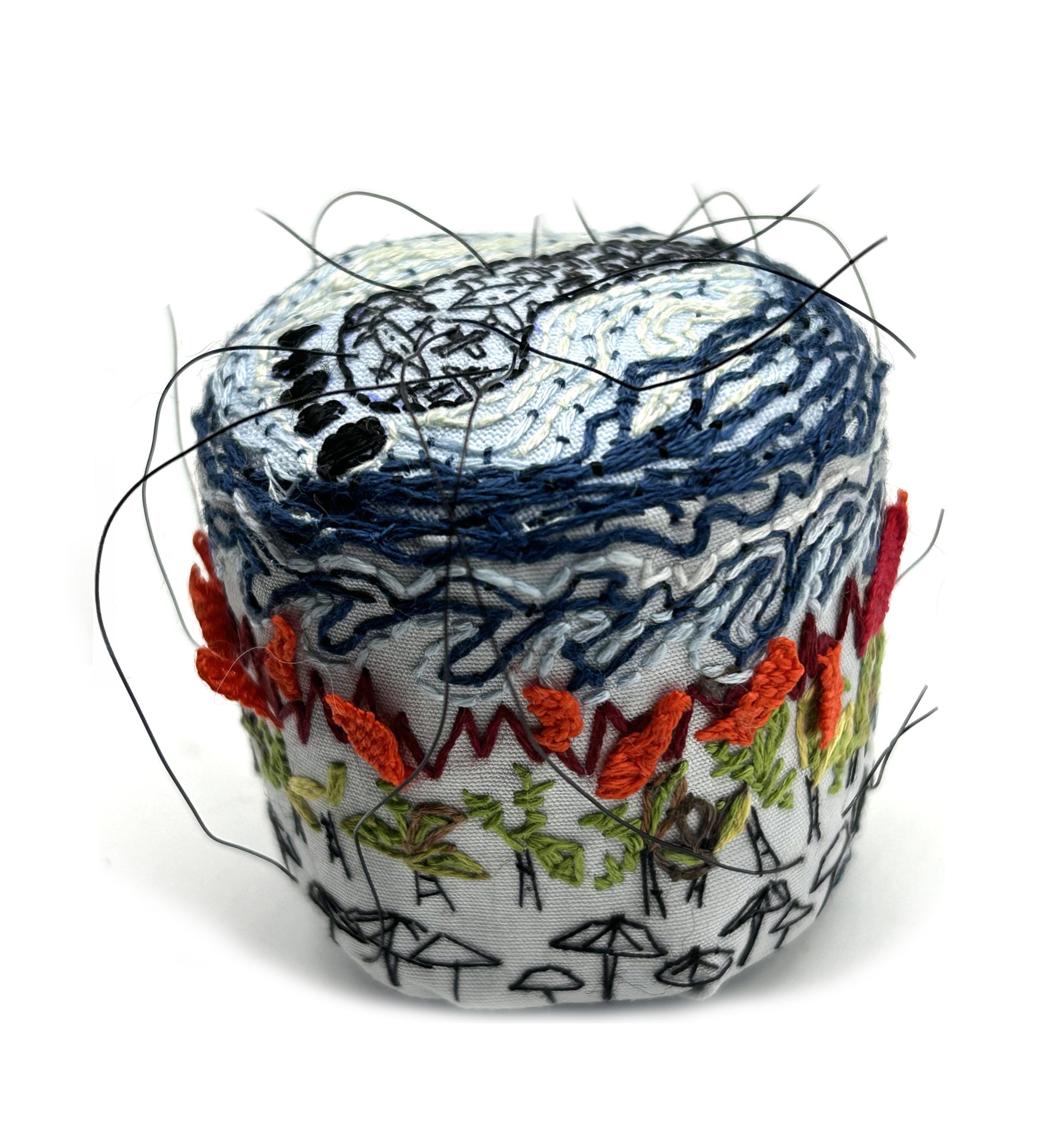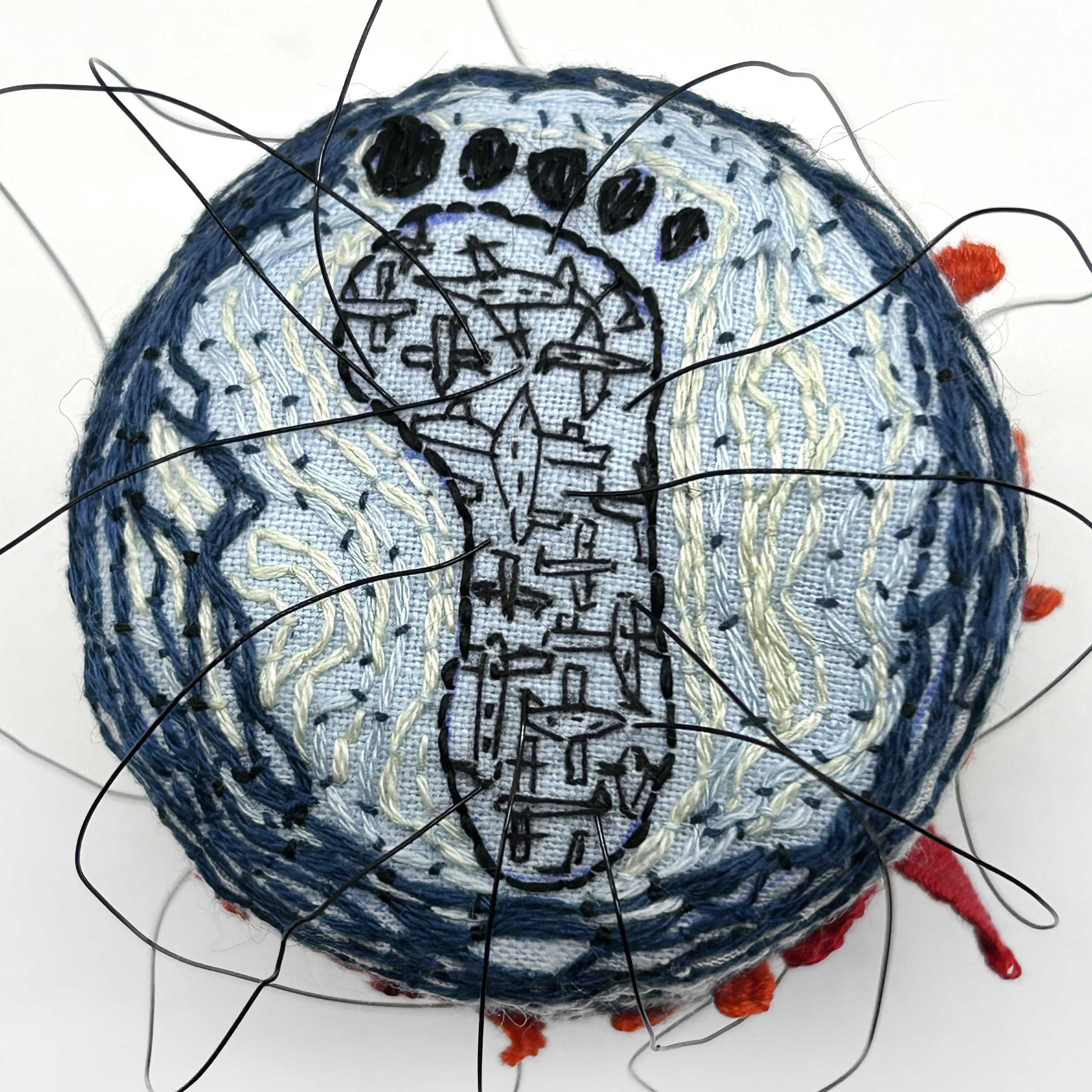 The planes filled footprint on the top surface creates a ripple outward to floods and wildfires in the top part of the side. Fine wire paths fly oblivious over the destruction to holiday destinations screened by a thin veneer of nature in the form of trees.