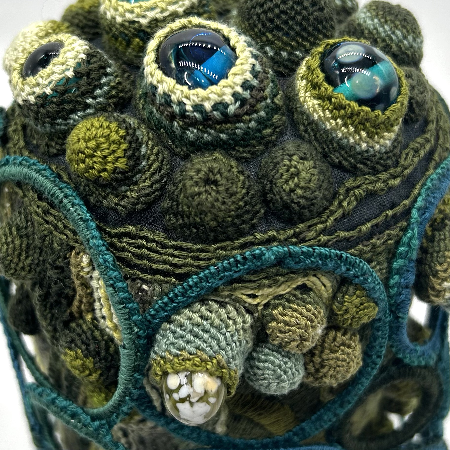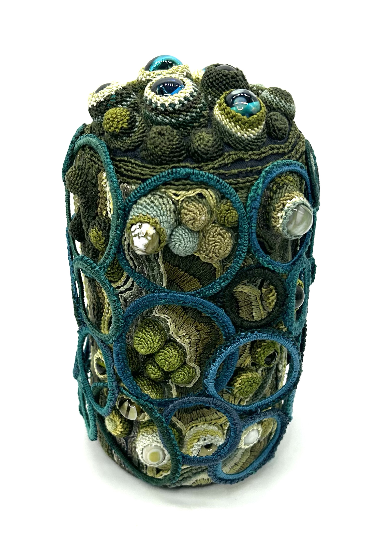 My embroidered sculpture is an imagined eco system made up of layers of hand embroidery and handmade glass beads. A healthy eco system is always evolving with parts dying and new parts appearing. The construction celebrates this system of renewal, while also glimpsing those of the past.