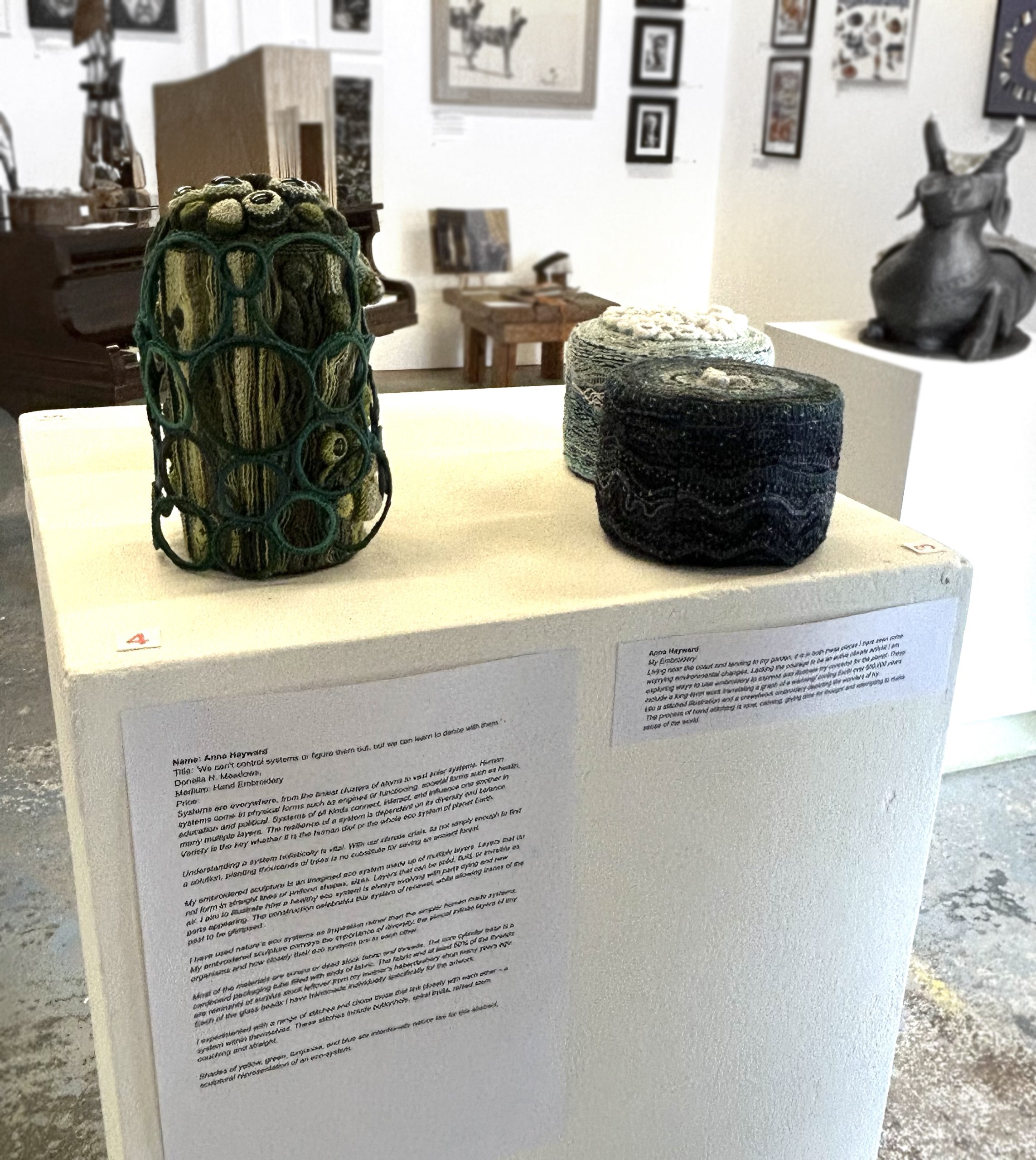 I have used nature’s eco systems as inspiration rather than the simpler human made systems. My embroidered sculpture conveys the importance of diversity, the almost infinite layers of tiny organisms and how closely their eco systems are to each other.