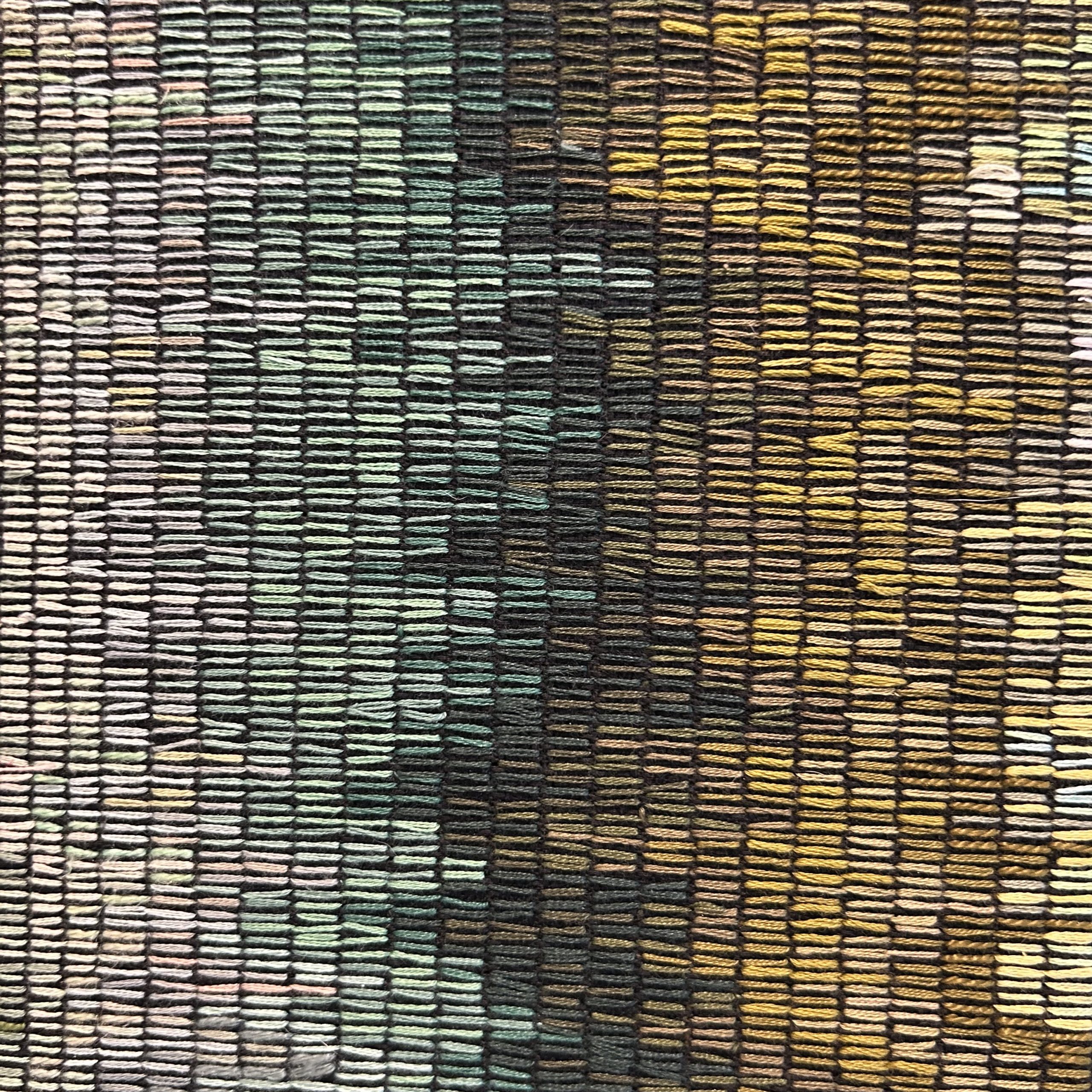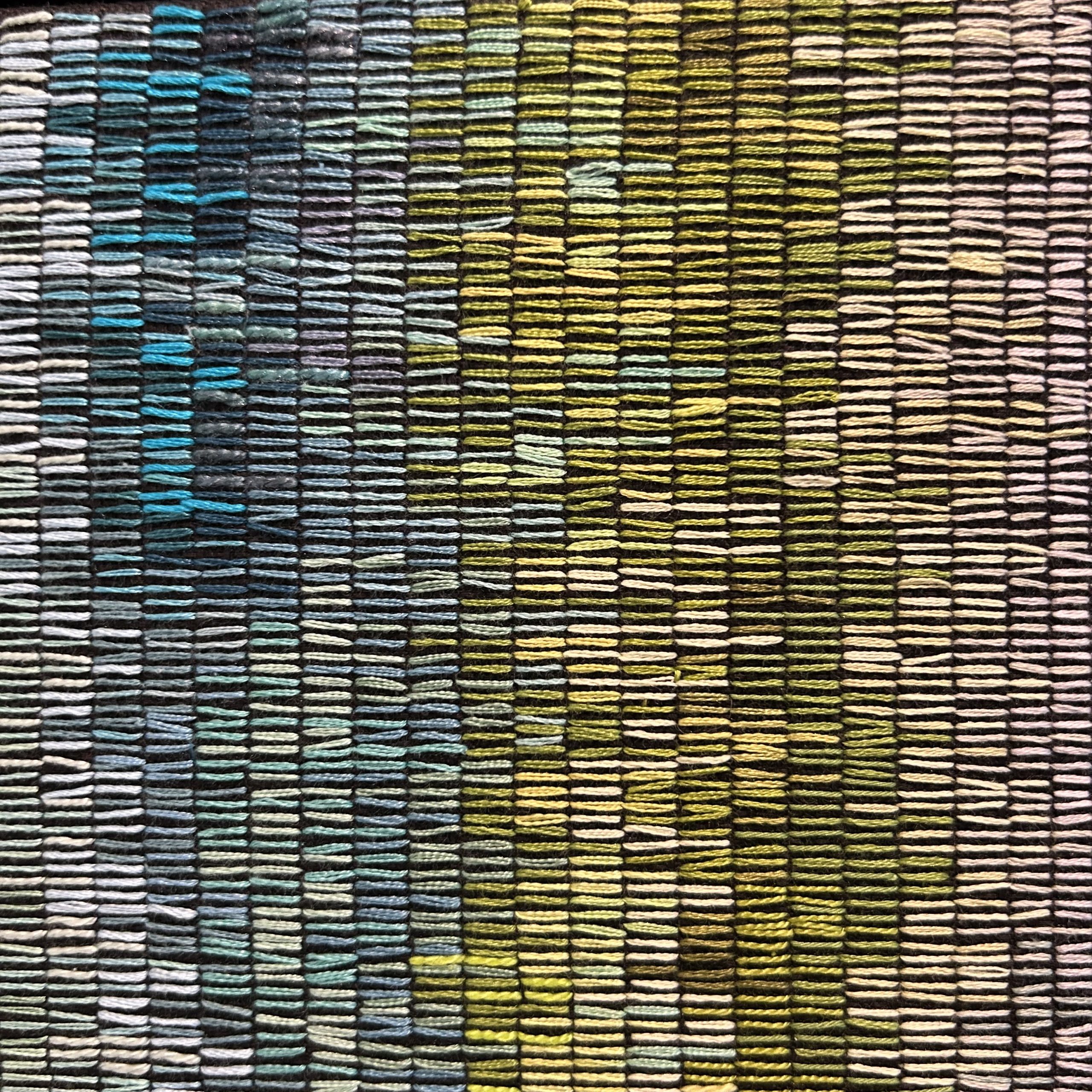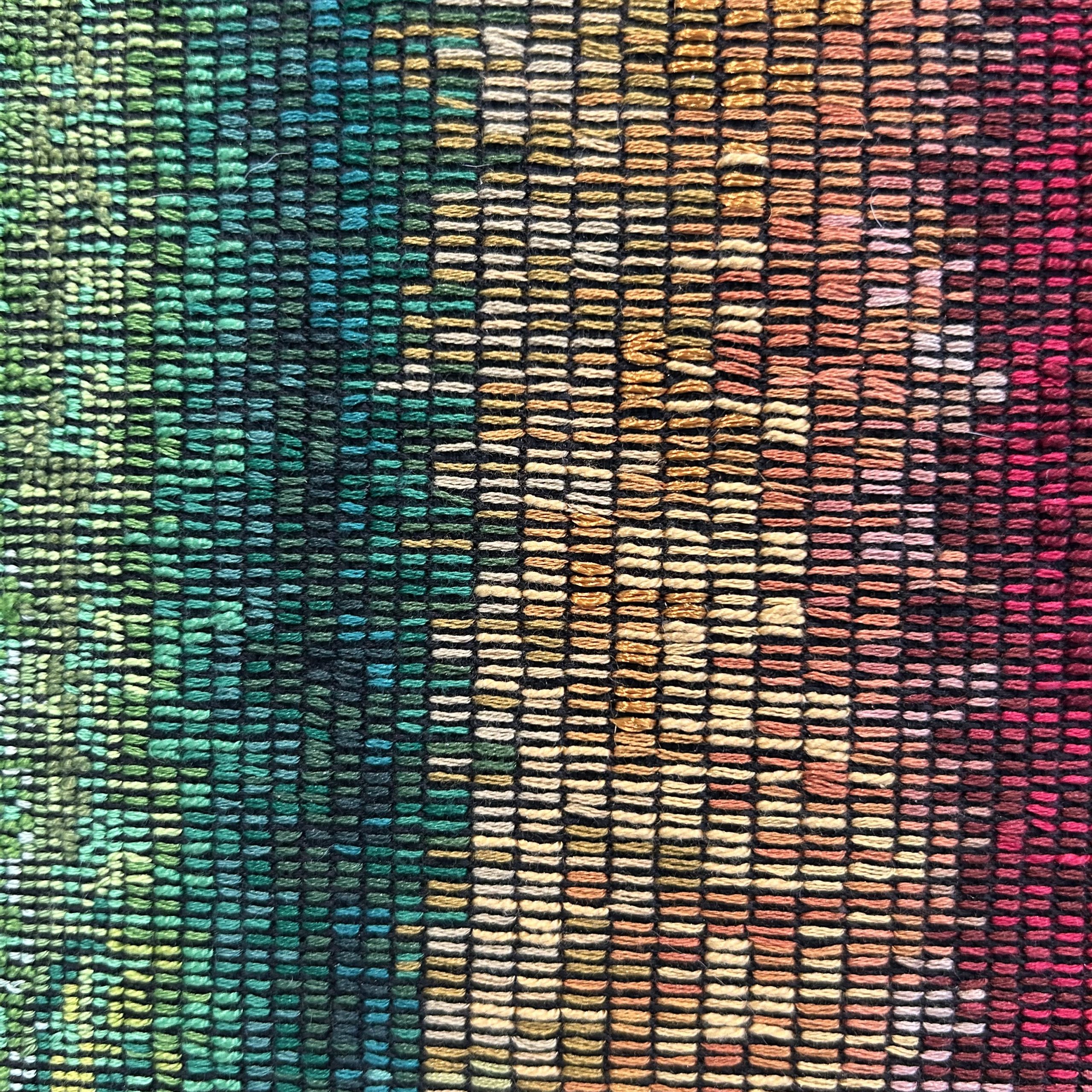 The intention of these of these seven panels is to softly counter the view of some that climate change is only a natural process. Inspired by a NASA graph contrasting natural global temperature change with human induced global warming. Each panel of approximately 24,000 stitches (one stitch = 4 years) represents 100,000 years of Earth’s most recent history. Fluctuations in temperature due to volcanic activity does indeed cause dramatic climate change, however this occurs softly over thousands of years.