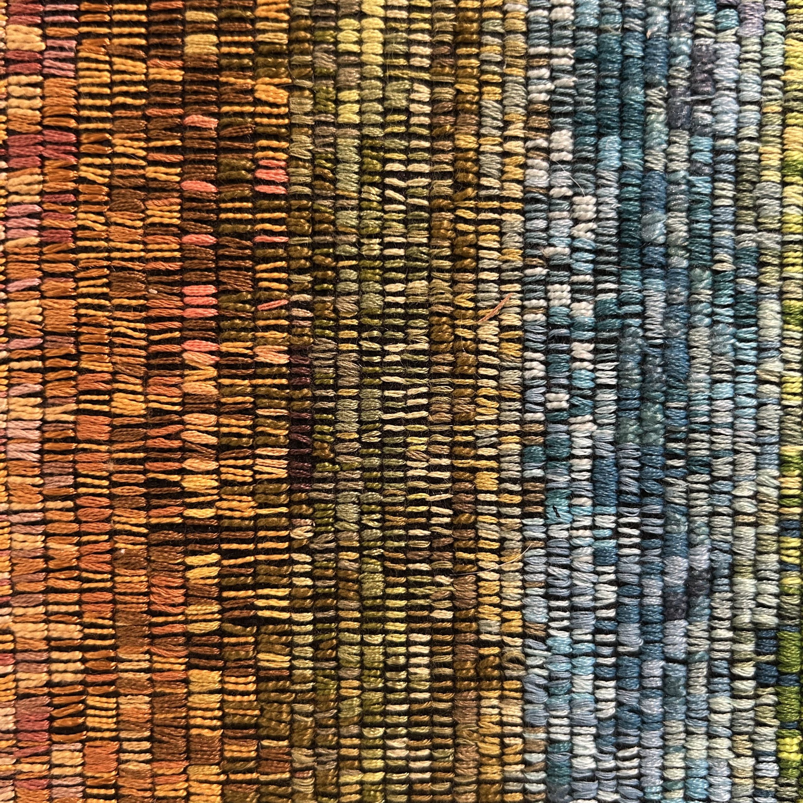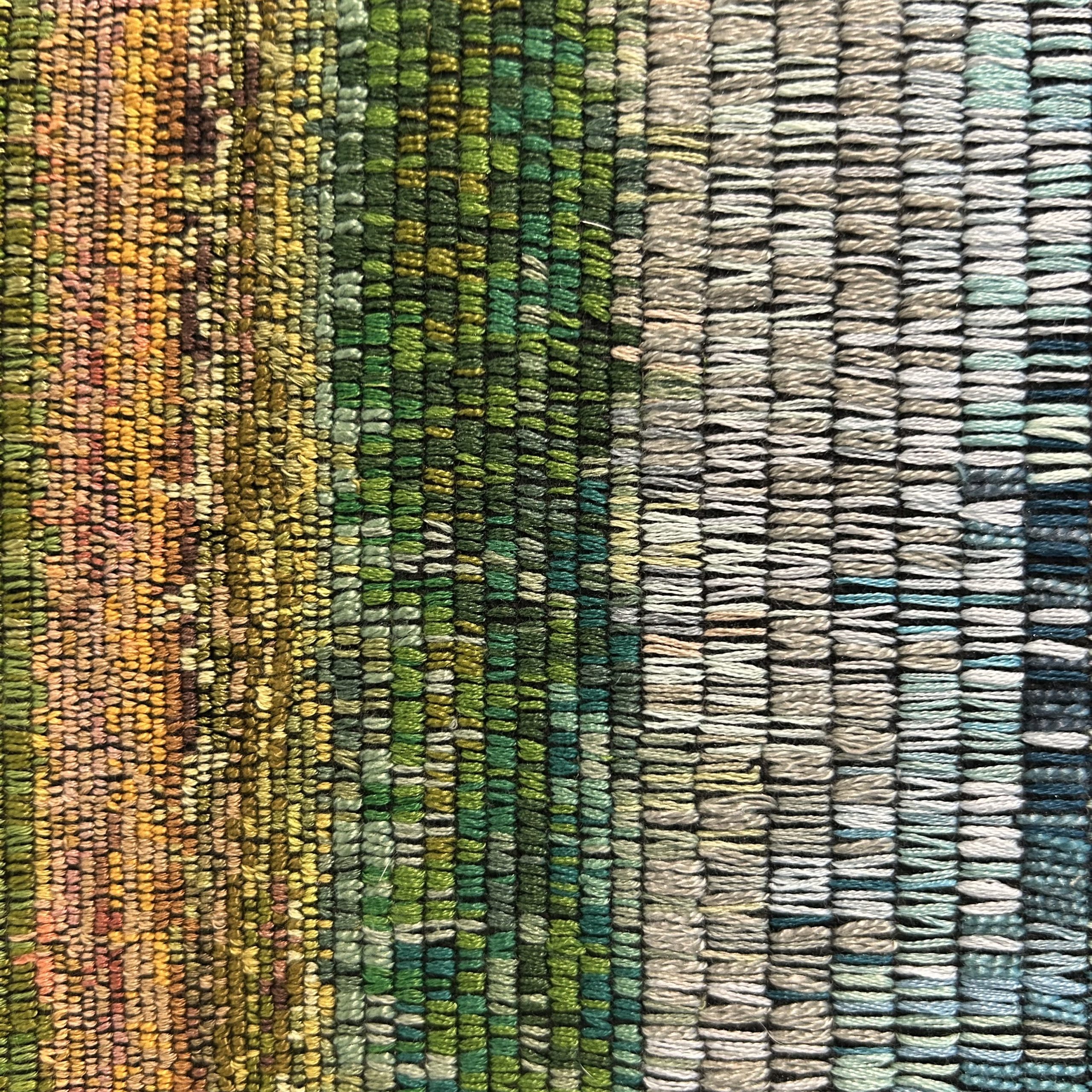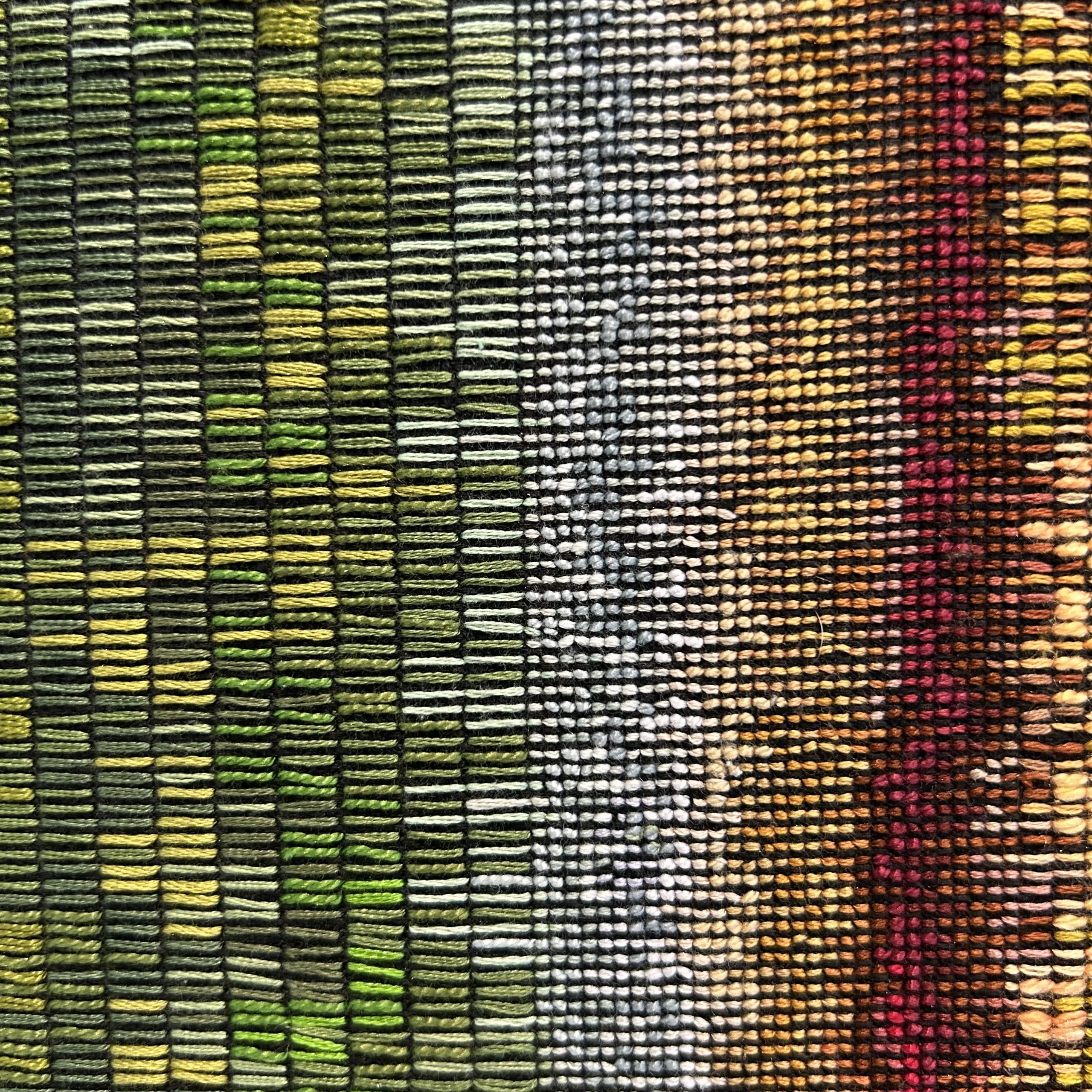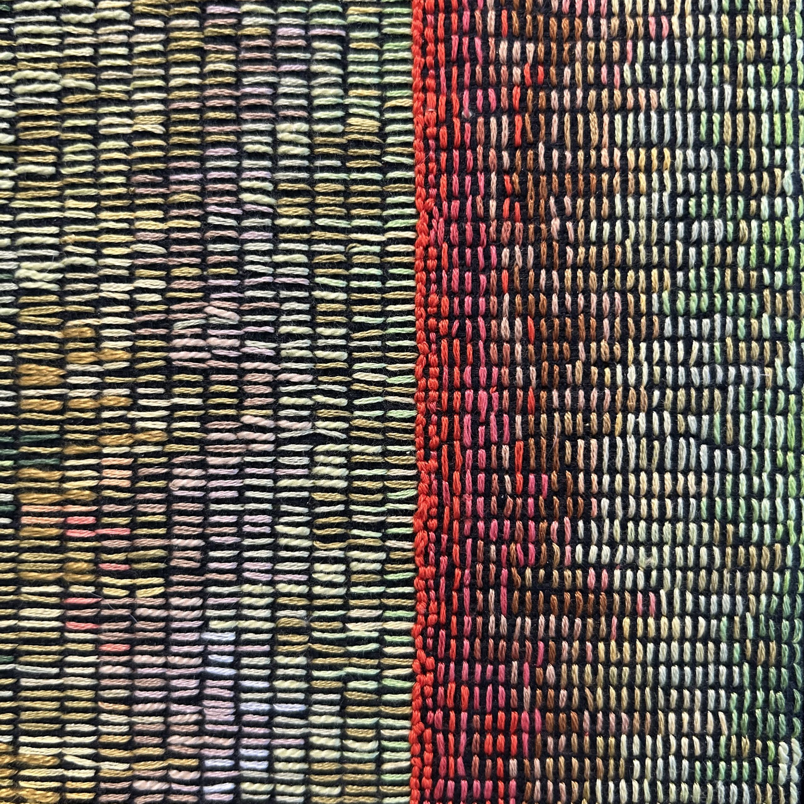 The intention of these of these seven panels is to softly counter the view of some that climate change is only a natural process. Inspired by a NASA graph contrasting natural global temperature change with human induced global warming. Each panel of approximately 24,000 stitches (one stitch = 4 years) represents 100,000 years of Earth’s most recent history. Fluctuations in temperature due to volcanic activity does indeed cause dramatic climate change, however this occurs softly over thousands of years.